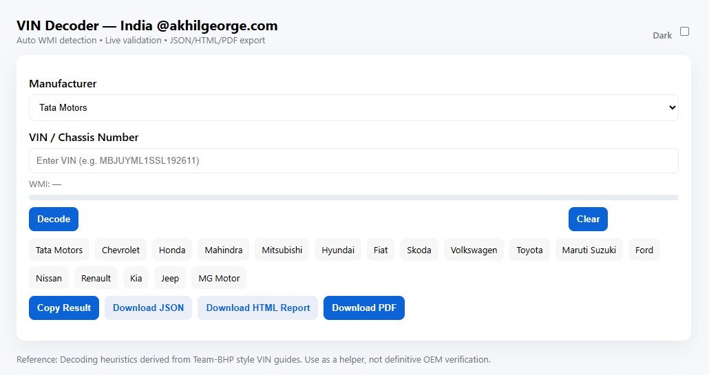 This challenge motivated me to create a simple VIN Decoder app specifically for Indian vehicles.