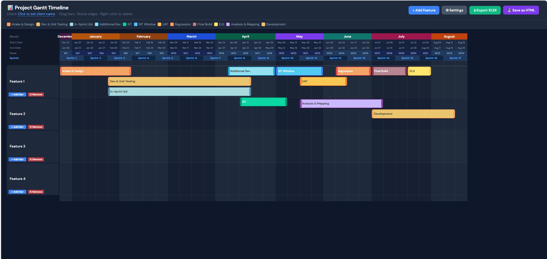 There are no client names hardcoded in. No internal project codes. No company-specific phases baked in that would make it awkward to hand to someone else. Everything — the phase names, the colours, the timeline dates, the sprint configuration — is configurable through the Settings panel.